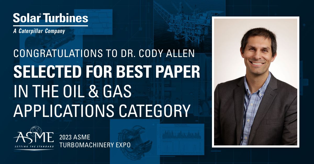 祝贺 Cody Allen 博士,其 2023 年撰写的论文在去年的涡轮机技术全方位世界领先会议 ASME 涡轮机械博览会上被选为石油和天然气应用组的“最佳论文”。该论文以延长所需维护停机间隔时间为目的,研究了相关的运行优化。论文的主要理念是估计系统关键组件剩余使用寿命,结合数学优化技术,确定设备的最佳运行时间表,以便在此运行时间表下,尽可能延长维护停机间隔时间。该框架为 Solar 的客户提供了许多应用,是 Solar Turbines 正在进行的尖端研究案例之一。